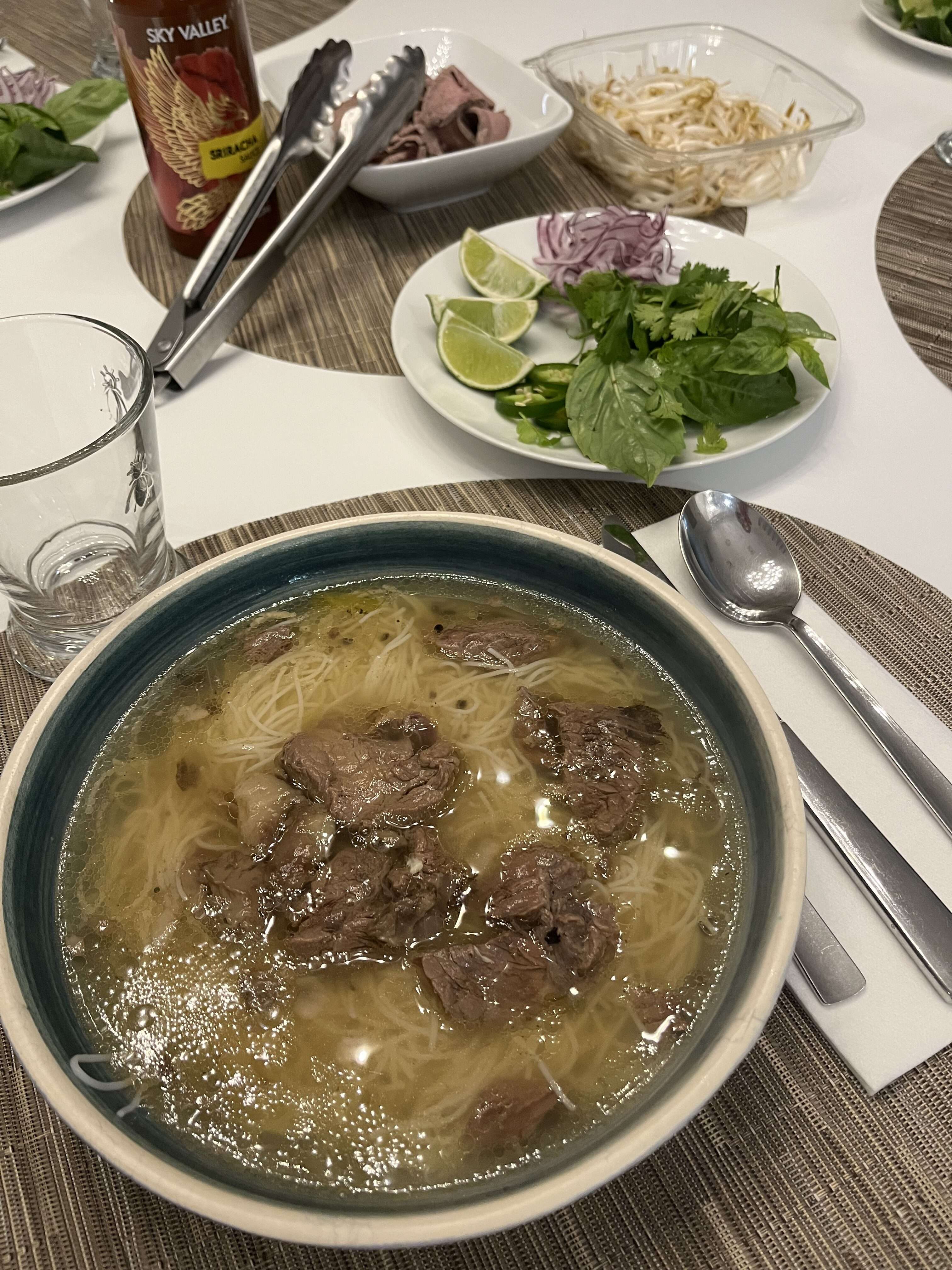 En unos platos soperos, poner los noodles por persona y con un cazo añadir el caldo con trozos de la carne y del tuétano. Se debe haber retirado las cebollas enteras para que el caldo quede mas limpio y fácil de emplatar. En plato individual poner la guarnición para que cada uno se ponga a su gusto. Yo prefiero que el filete crudo troceado finamente se ponga en la mesa para que cada persona se sirva lo que quiera.