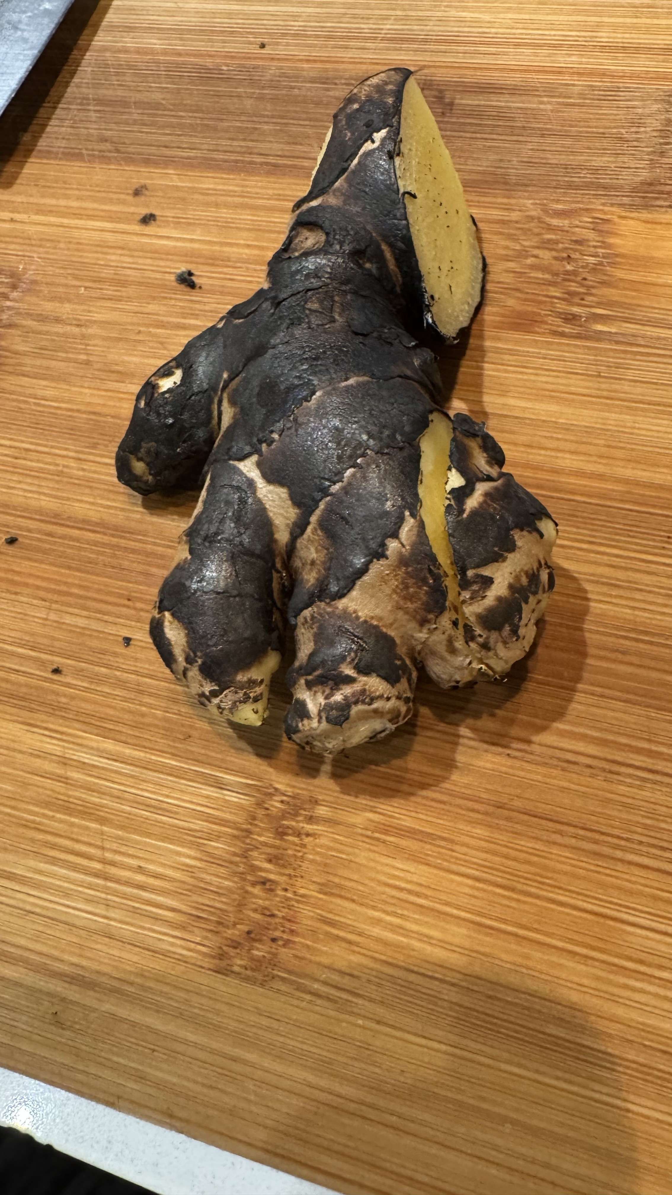 Poner el jenjibre y las cebollas a tostarse con una llama de la cocina de gas, en su defecto con un soplete. En último caso en el horno con el grill, Esto realzará su sabor y le aportará un toque ahumado. Alrededor de 5 min.